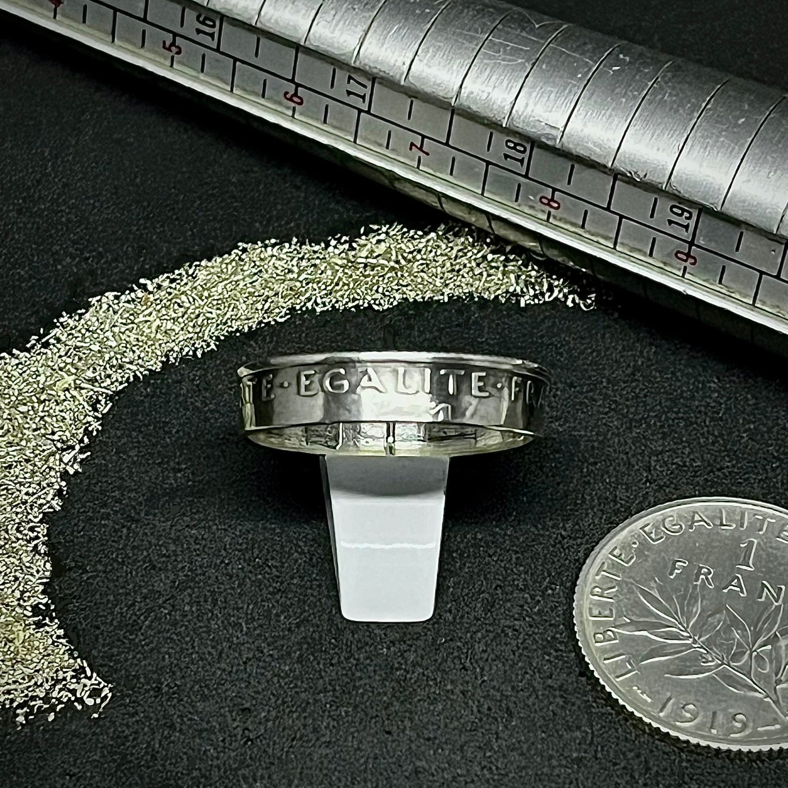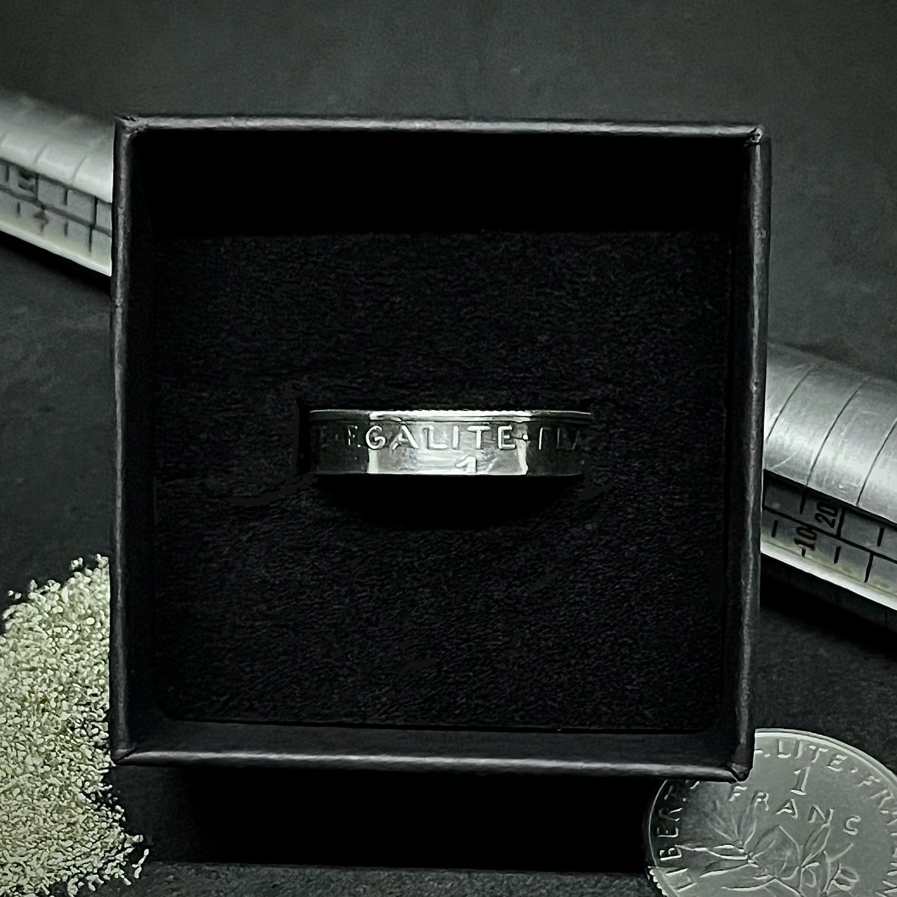 Réalisée à partir d'une authentique 1 Franc Semeuse (1898-1920), cette bague unique célèbre l'héritage français avec l'inscription « Liberté, Égalité, Fraternité » à l'extérieur et la Marianne gravée au cœur de l'anneau.