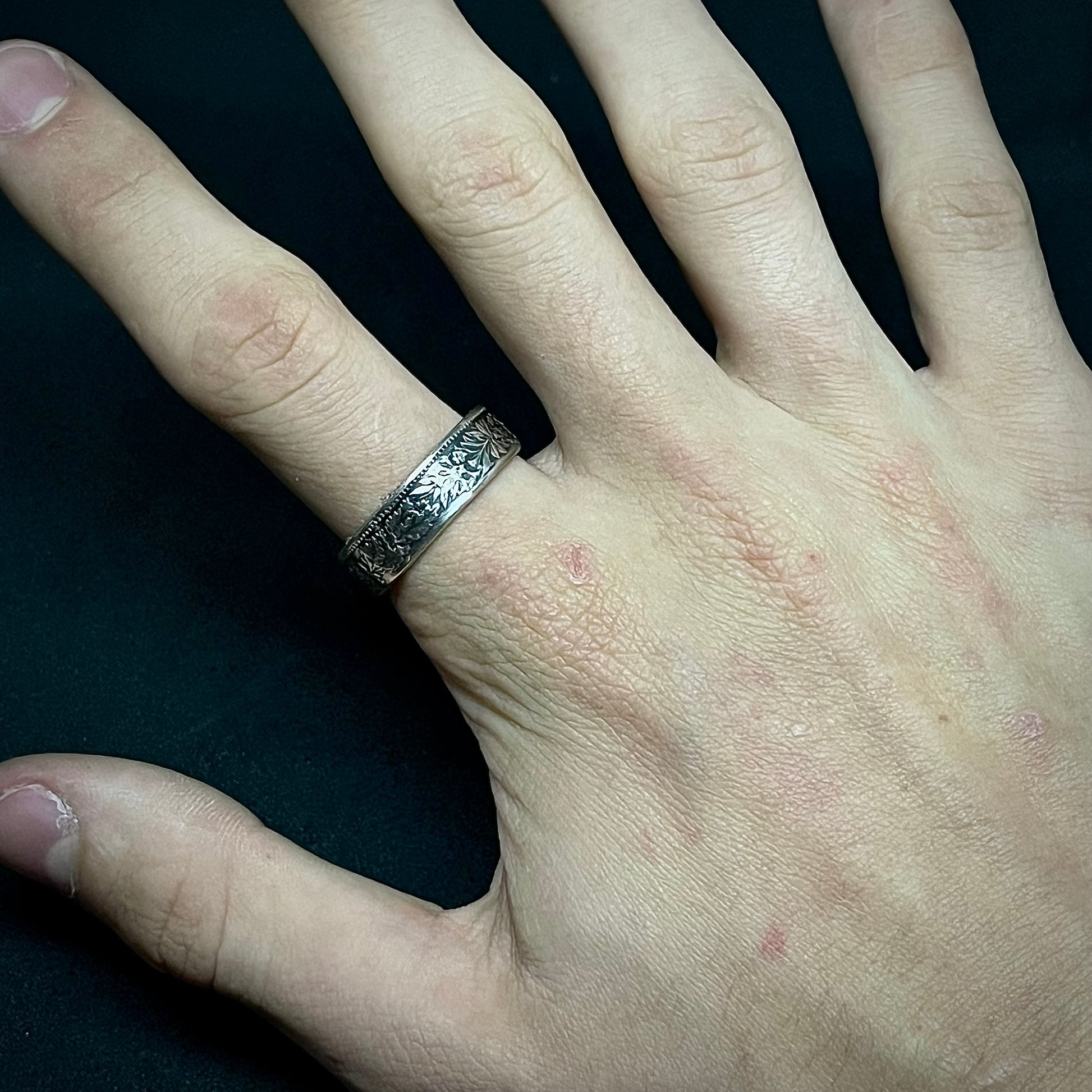 Réalisée à partir d'une authentique 2 Francs Suisse Helvetia (1848), cette bague unique présente les feuilles de chêne et les roses des Alpes à l'extérieur, avec les étoiles gravées au cœur de l'anneau.